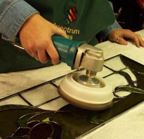 Add a little Pzazz to your project and finish it off with a high shine. The Pzaz natural bristle brush will do a final clean and polish of the glass, lead and copper foil solder lines. Simply insert the shaft into any lightweight 3/8” hand-held power drill. Hold the brush at a slight angle on the project and run it right to left and up and down in a small area. The images below show the Pzaz Luster Brush with a Makita corded right-angle drill and with a Makita cordless pistol-grip drill.